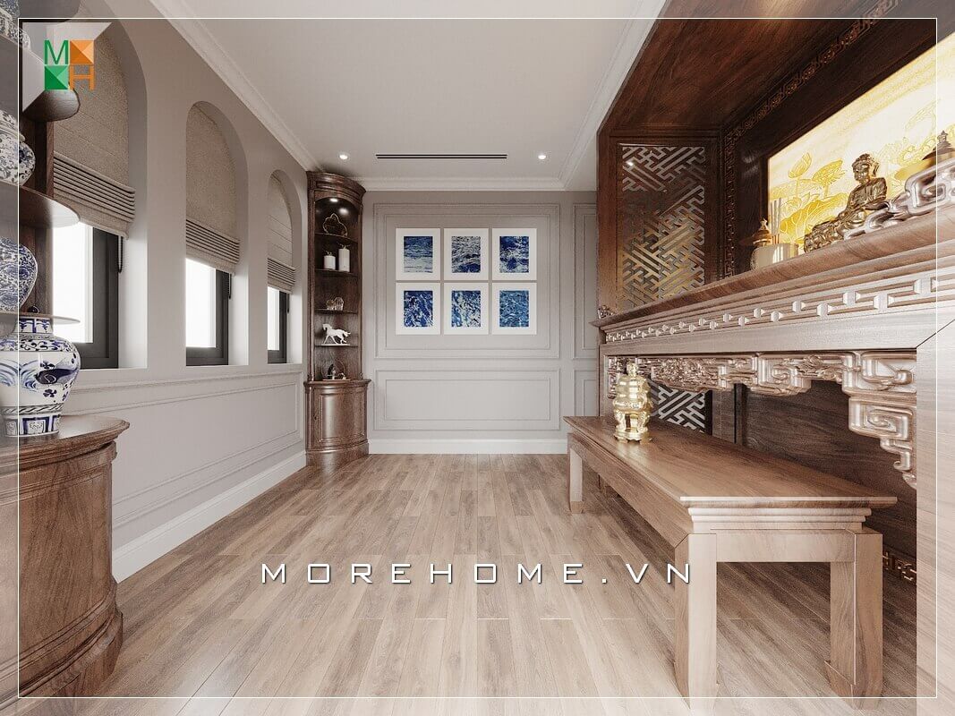 Thiết kế ấn tượng với họa tiết bàn thờ và kệ được đặt hai góc phòng điều khắc sắc xảo, chất liệu gỗ tự nhiên óc chó cao cấp sang trọng.