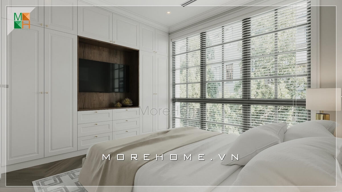 Hệ thống tủ quần áo âm tường hiện đại bố trí trong không gian phòng ngủ của biệt thự thêm phần tiện nghi, hiện đại.