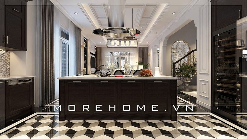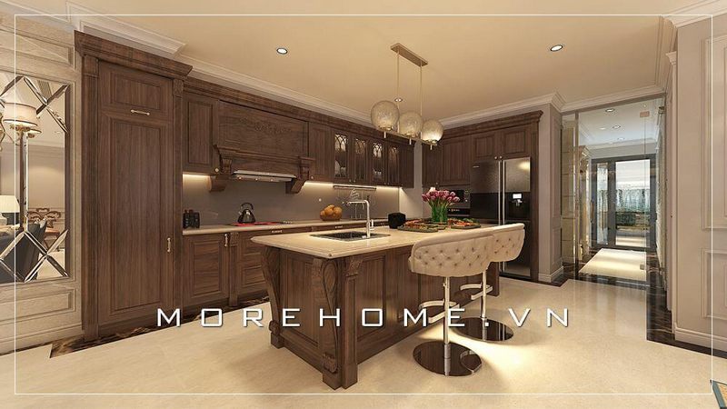 Thiết kế nội thất phòng bếp biệt thự tân cổ điển sử dụng tone màu trầm ấm cúng, sang trọng và đẳng cấp