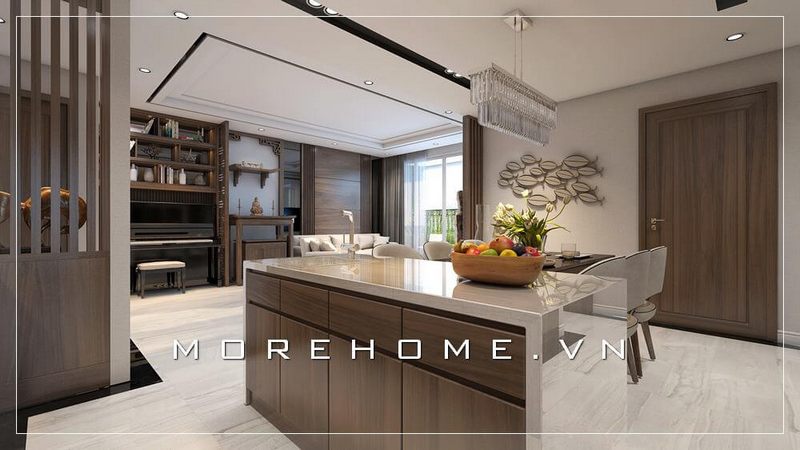 Mẫu bàn đảo bếp với ốp đá trắng vân mây được thiết kế để làm vách ngăn và cung cấp một nơi tiện lợi để người nội trợ có thể để đồ.